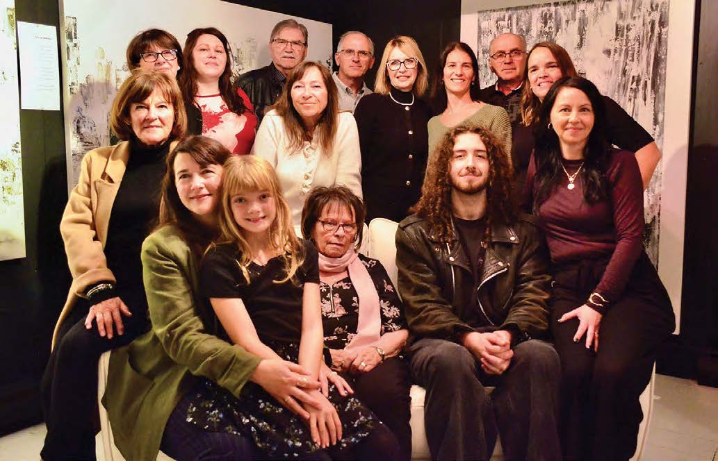 Plusieurs membres de la famille élargie de Gilbert Langlois étaient présents lors de la commémoration du 20e anniversaire de son décès. À chaque extrémité de la première rangée, ses deux filles, Flavie et Élise. Photo : Johanne Fournier