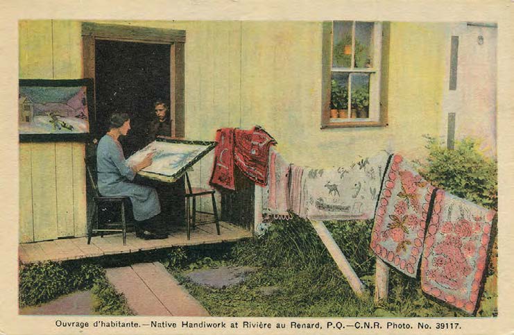 D’ailleurs, de nombreuses cartes postales représentent ces kiosques. Certaines dépeignent aussi des femmes vendant leurs oeuvres directement à partir de leur maison (généralement située près de la route). Elles sont parfois photographiées à l’extérieur, assises sur leur galerie. Nous savons aussi que les femmes vendaient sur les quais, en attente de l’arrivée des traversiers, comme du bateau de la Clarke, dans les années 1930. Bref, en l’absence de débouchés commerciaux concrets, les femmes vont là où le touriste passe.