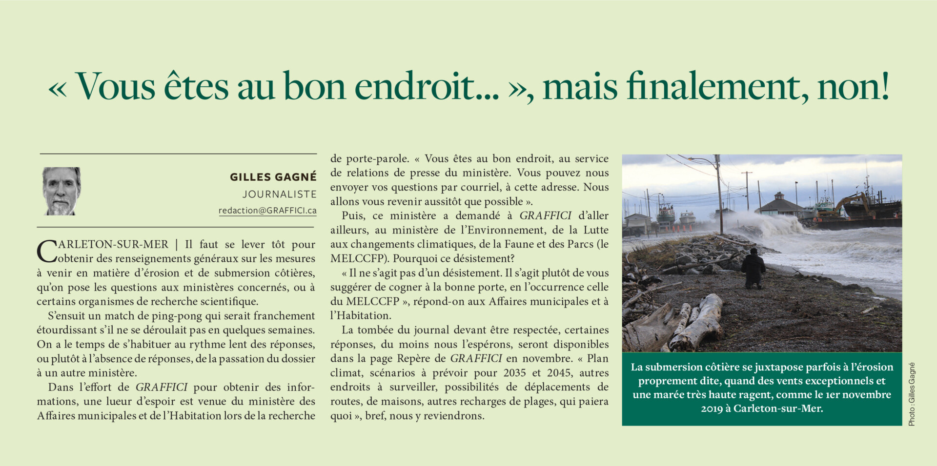 Depuis 25 ans, l’érosion côtière constitue un problème prenant de l’ampleur en Gaspésie. Des tempêtes alliées à de fortes marées, l’absence d’un couvert de glace en hiver, des épisodes de vent et de pluies soudaines de plus en plus fréquents contribuent à identifier des secteurs plus fragiles et à accélérer le processus de décision, le cheminement des études et les actions qui en découlent. GRAFFICI s’intéresse dans ce dossier à l’évolution récente de l’érosion côtière, notamment en identifiant des endroits où des interventions sont en cours, ou qui en feront l’objet sous peu.