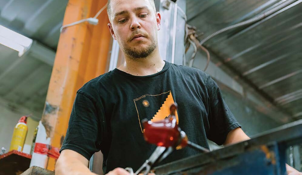 L’artisan verrier Alexandre Bellemare dans son atelier, Le Cueilleur de verre. Photo :Roger St-Laurent